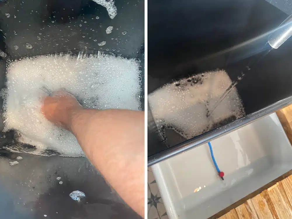 Optional deep-clean options include vinegar soaks for mineral buildup, light baking soda scrubbing, or a boiling water pour-through. Always let mats dry fully before storage or reuse. Do not put in a washing machine or dryer as this can damage the capillary material. Always hand wash and air dry.